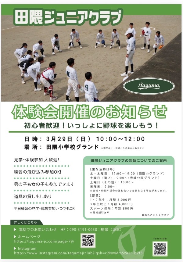田隈ジュニアクラブ体験会のご案内です。